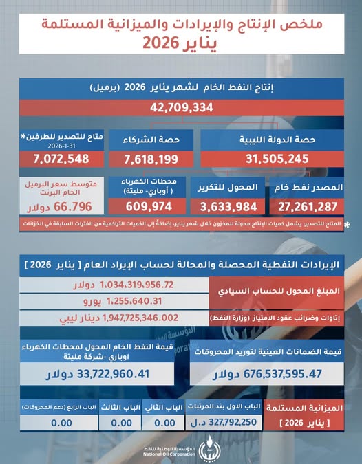 أعلنت المؤسسة الوطنية للنفط، في إطار نهج الشفافية والإفصاح الدوري، عن حصيلة الإنتاج والإيرادات المالية والميزانية المستلمة لشهر يناير 2026، مشيرة إلى استمرار التزامها بإطلاع المواطنين والجهات الرقابية على حجم الثروة النفطية.