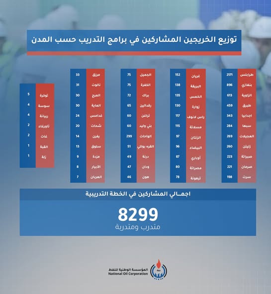 نشرت المؤسسة الوطنية للنفط التقرير الإحصائي الشامل لبرنامج تدريب الخريجين، في إطار ما وصفته بالتزامها بمبدأ الشفافية والإفصاح، موضحة الأرقام التفصيلية للمشاركين والتوزيع الجغرافي للمتدربين في مختلف المدن الليبية.