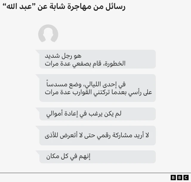 وفي رسائلها النصية، وصفت كيف كانت تخشى أحد رجال الملاح، الذي كانت تسميه "عبد الله".