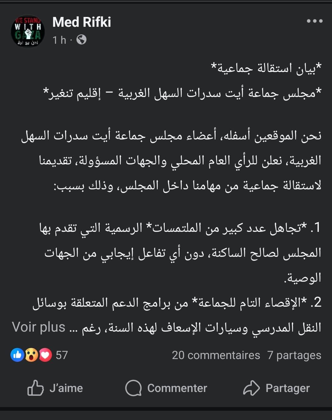 ونشر رئيس الجماعة، أمس الخميس، على صفحته بـ”فيسبوك” بيان استقالة جماعية لأعضاء مجلس الجماعة، وهو ما أكده أيضا في اتصال مع جريدة “العمق”، مرجعا هذه الاستقالة إلى عدم تجاوب المجلس الإقليمي والعمالة مع مطلب توفير سيارات للنقل المدرسي والإسعاف.