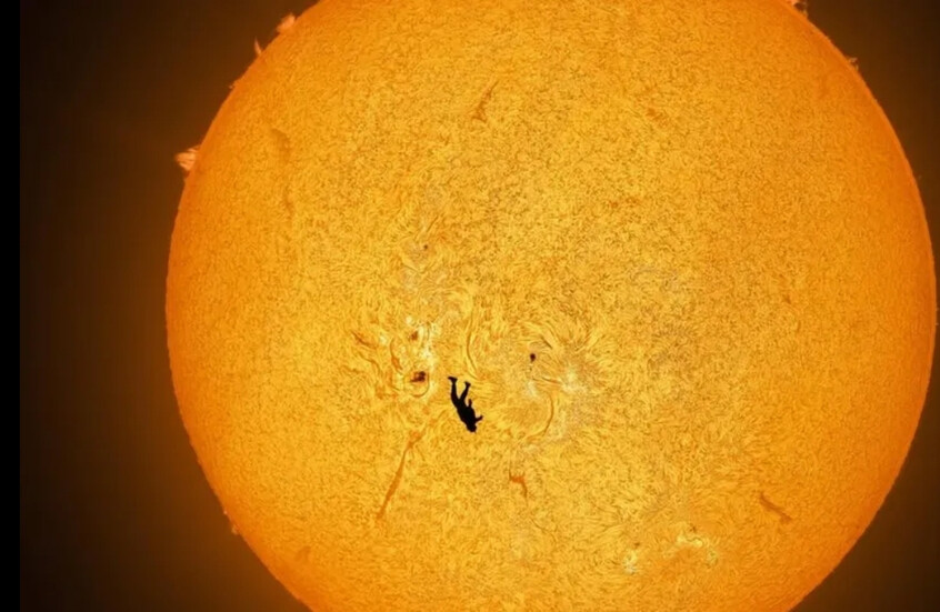 التقط مصور الفضاء أندرو مكارثي لقطة نادرة للشمس مع مظلي يسقط من السماء، ما أنتج صورة مذهلة لإنسان يظهر كظل أمام سطح الشمس الملتهب.