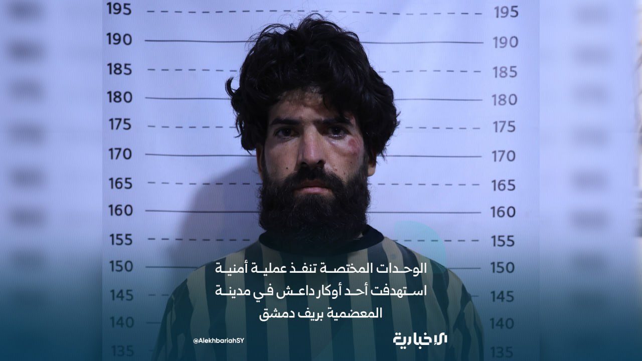 وأوضح أن العملية التي تمت في مدينة المعضمية بمحافظة ريف دمشق، "جاءت ثمرة متابعة استخباراتية مكثفة ورصد دقيق، وأسفرت عن إلقاء القبض على أحد أبرز العناصر الخطيرة، وهو المطلوب المدعو طه الزعبي والمعروف بألقاب (أبو عمر طبية) و(والي دمشق) للتنظيم الإرهابي، بالإضافة إلى عدد من مساعديه المباشرين".