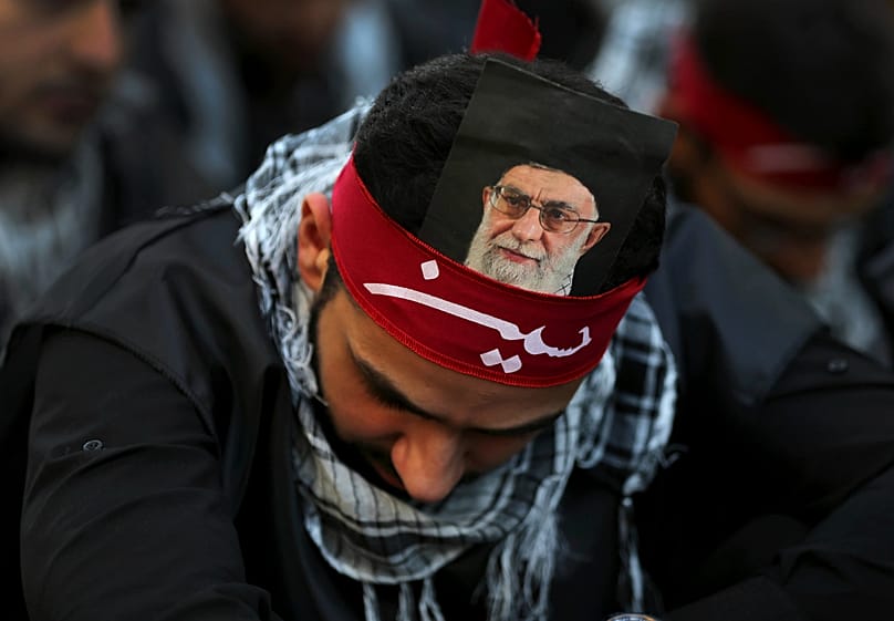 مصدر الصورة 12 أكتوبر/تشرين الأول 2016 — مُناصر لحزب الله يشارك في إحياء عاشوراء في الضاحية الجنوبية لبيروت حاملًا صورة للمرشد الإيراني علي خامنئي. AP Photo/Hussein Malla