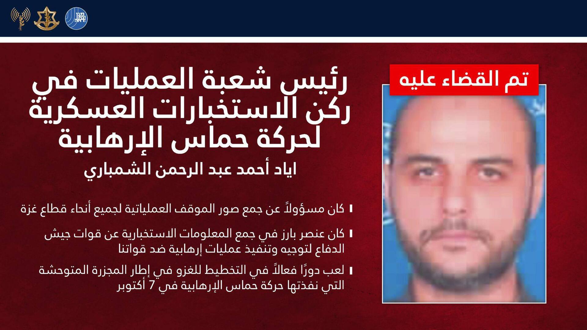 ووفق البيان، فإن شمباري، رئيس قسم العمليات في مقر المخابرات العسكرية لحركة حماس، كان مسؤولا خلال السنوات الأخيرة عن إعداد التقييمات العملياتية الشاملة لقطاع غزة بأكمله، ويعد شخصية محورية في جمع المعلومات الاستخباراتية حول تحركات القوات الإسرائيلية لتوجيه وتنفيذ خطط هجومية ضدها، مما شكل تهديدا فوريا للقوات العاملة في المنطقة.
