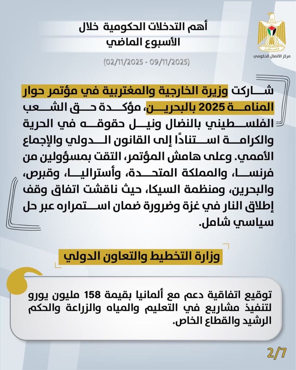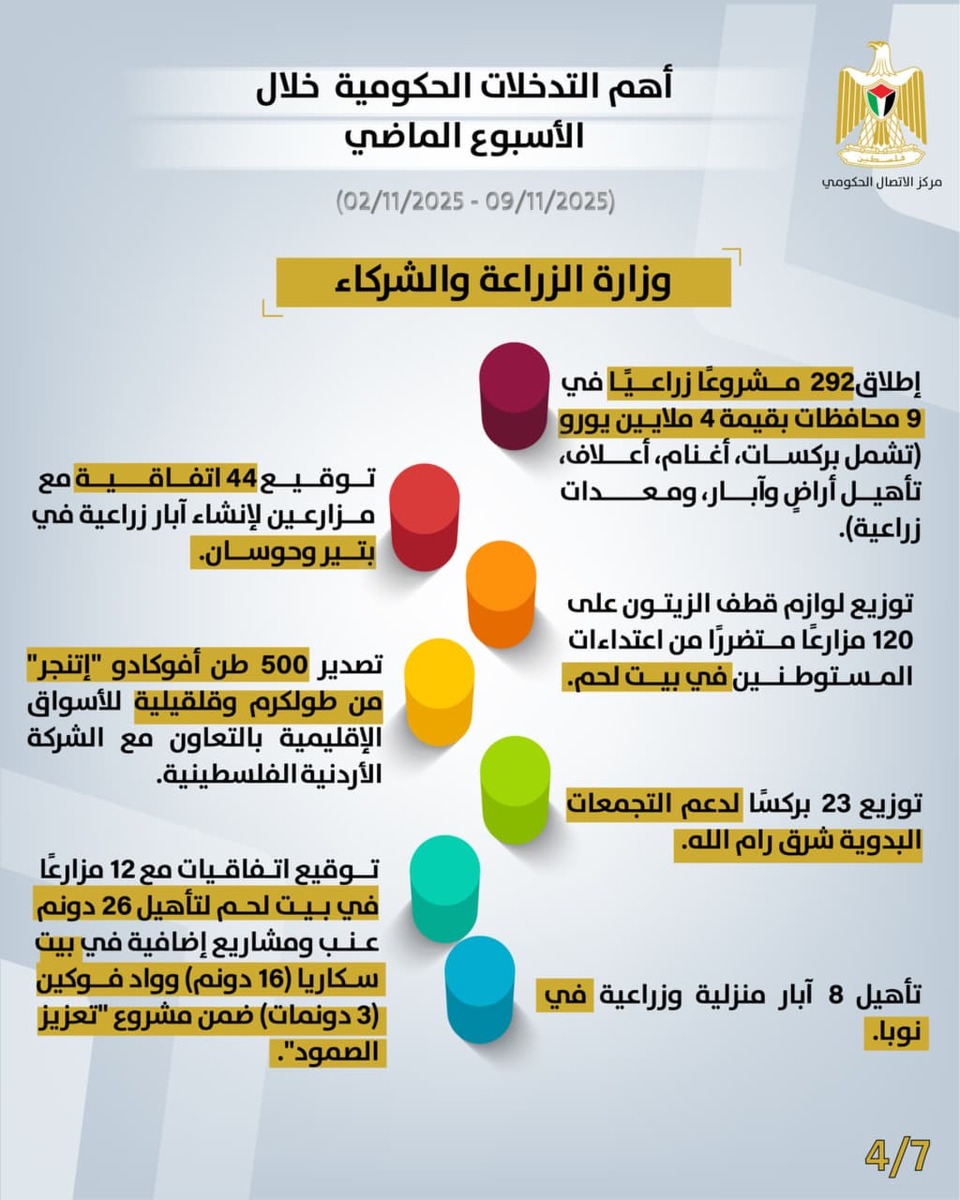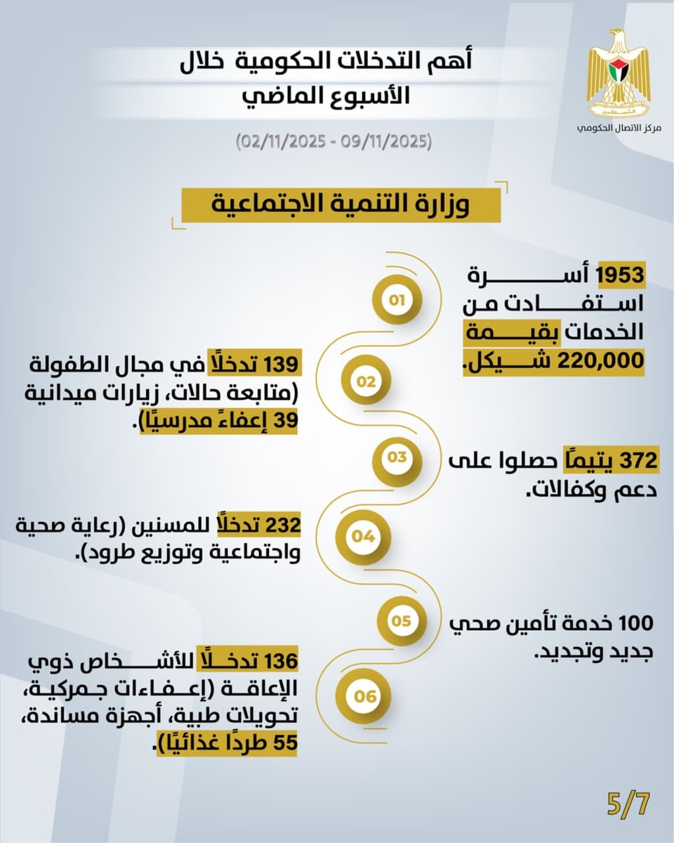 أصدر مركز الاتصال الحكومي تقريرًا يُبرز أهم التدخلات التنموية والإصلاحية التي نَفَّذَتها الحكومة الفلسطينية، خلال الأسبوع الماضي (02/11/2025 – 09/11/2025)، وهي على النحو الآتي: