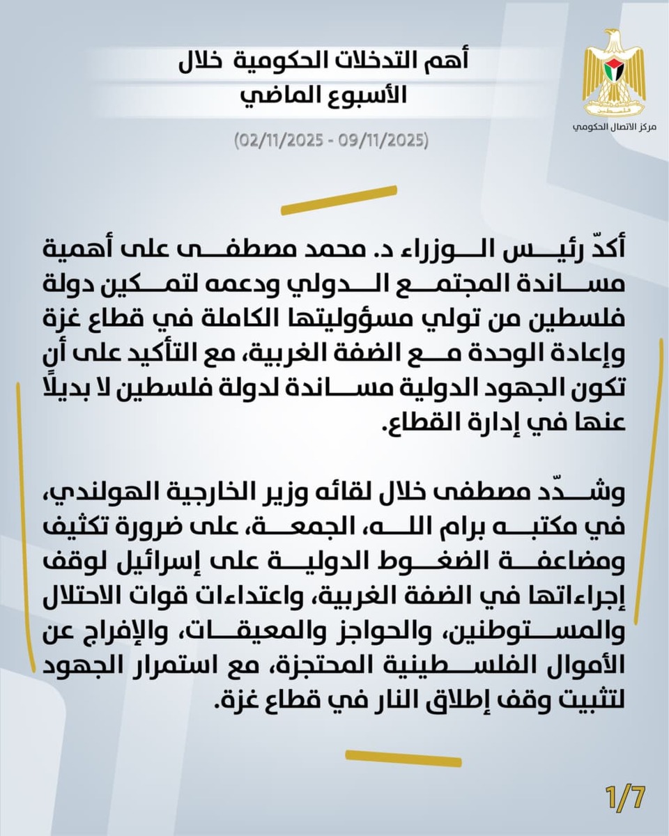 ⭕ أكدّ رئيس الوزراء د. محمد مصطفى أهمية مساندة المجتمع الدولي ودعمه لتمكين دولة فلسطين من تولي مسؤوليتها الكاملة في قطاع غزة وإعادة الوحدة مع الضفة الغربية، مع التأكيد أن تكون الجهود الدولية مساندة لدولة فلسطين لا بديلًا عنها في إدارة القطاع. وشدّد مصطفى، خلال لقائه وزير الخارجية الهولندي، الجمعة، في مكتبه برام الله، على ضرورة تكثيف ومضاعفة الضغوط الدولية على إسرائيل لوقف إجراءاتها في الضفة الغربية، واعتداءات قوات الاحتلال والمستوطنين، والحواجز والمعيقات، والإفراج عن الأموال الفلسطينية المحتجزة، مع استمرار الجهود لتثبيت وقف إطلاق النار في قطاع غزة.