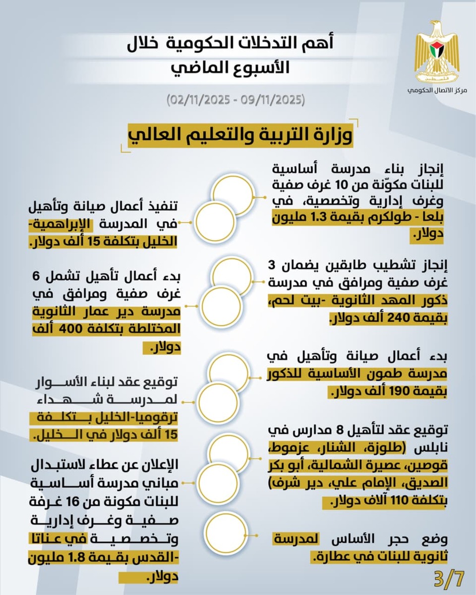 ⭕ أنجَزَت وزارة التربية والتعليم العالي بناء مدرسة بلعا الأساسية للبنات في طولكرم بقيمة 1.3 مليون دولار، وتشطيب طابقين في مدرسة ذكور المهد الثانوية ببيت لحم بقيمة 240 ألف دولار، وصيانة المدرسة الإبراهيمية في الخليل بقيمة 15 ألف دولار. كما بدأت أعمال تأهيل مدرسة دير عمار الثانوية المختلطة في رام الله بقيمة 400 ألف دولار، ومدرسة طمون الأساسية للذكور في طوباس بقيمة 190 ألف دولار، إضافةً إلى توقيع عقد لبناء أسوار مدرسة شهداء ترقوميا في الخليل بقيمة 15 ألف دولار، وعقد لتأهيل 8 مدارس في نابلس بقيمة 110 آلاف دولار. كما أعلنت عن عطاء لاستبدال مباني مدرسة عناتا الأساسية للبنات بقيمة 1.8 مليون دولار. كما عقدت الوزارة انتخابات البرلمان الطلابي الفلسطيني الموحد، ووضعت حجر الأساس لمدرسة عطارة الثانوية للبنات، ونَفَّذَت جولة ميدانية في مدارس جنوب نابلس للاطلاع على واقع التعليم. كما كَرَّمت بطلة آسيا في المواي تاي من مدرسة بنات البيرة الثانوية، وأطلقت مسابقة فنان هذا العام، واختتمت فعاليات الأسبوع العالمي للتربية الإعلامية والمعلوماتية بعقد ورشة رقمية إقليمية بالشراكة مع مؤسسة بيالارا. فيما أعلنت الوزارة عن منح دراسية في جامعة "Comsats" بباكستان لدرجتي الماجستير والدكتوراه، ومنح في سنغافورة لدرجة البكالوريوس للعام الأكاديمي 2026–2027.
