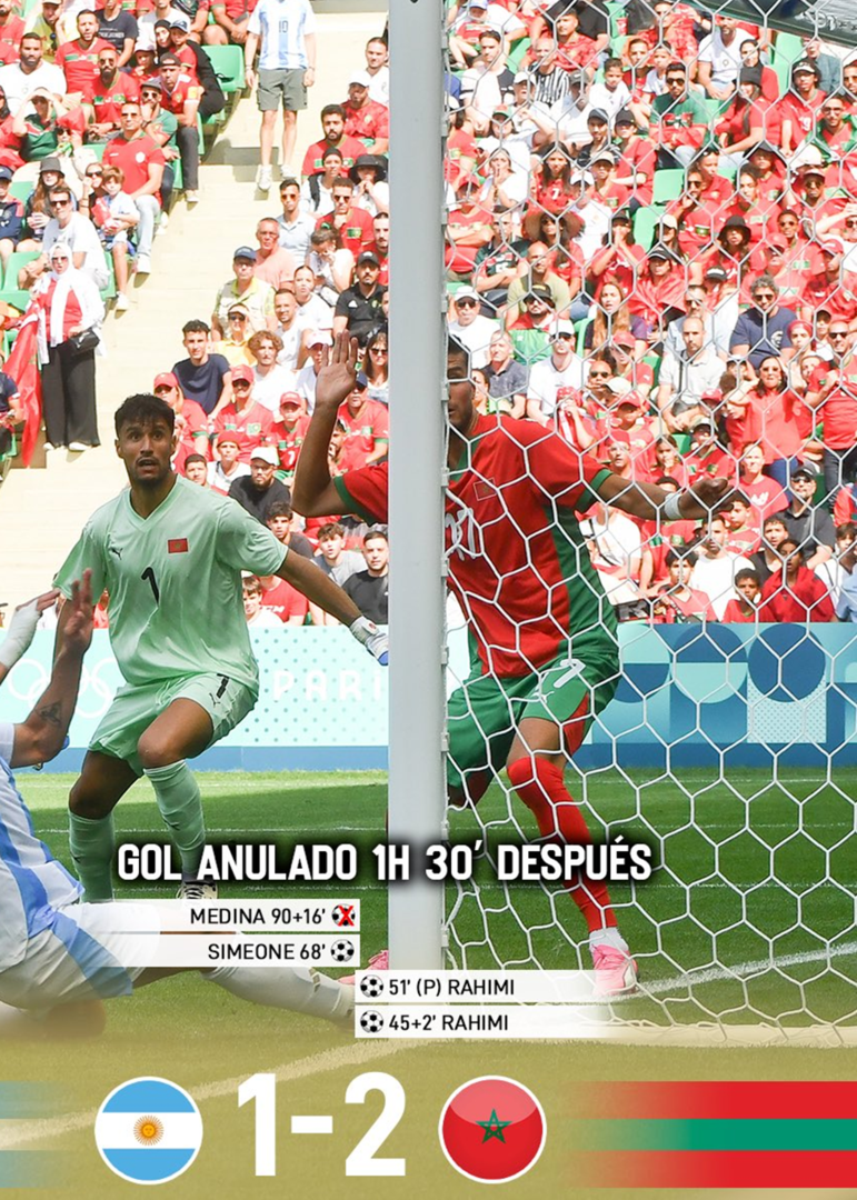 واستغرق إخلاء الملعب وإجراء الفحوصات الأمنية نحو ساعتين، عاد خلالهما اللاعبون إلى أرضية الملعب ليجري الحكم مراجعة تقنية الفيديو المساعد (الفار) للهدف الأرجنتيني الأخير الذي تبين فيما بعد أنه جاء من حالة تسلل، واستكمل اللقاء لثلاث دقائق قبل أن يطلق الحكم صافرته معلنا فوز المغرب 2-1.