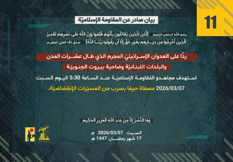 وأوضح "حزب الله" في بيان: "استهدف مجاهدو المقاومة الإسلاميّة عند الساعة 5:30 من فجر اليوم السبت 07/03/2026 مصفاة حيفا بسرب من المسيرات الإنقضاضية".