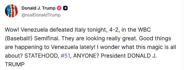 وكتب ترامب في حسابه على منصة "تروث سوشيال": "واو! في المساء، فازت فنزويلا على إيطاليا بنتيجة 4-2 في نصف نهائي بطولة العالم للبيسبول".