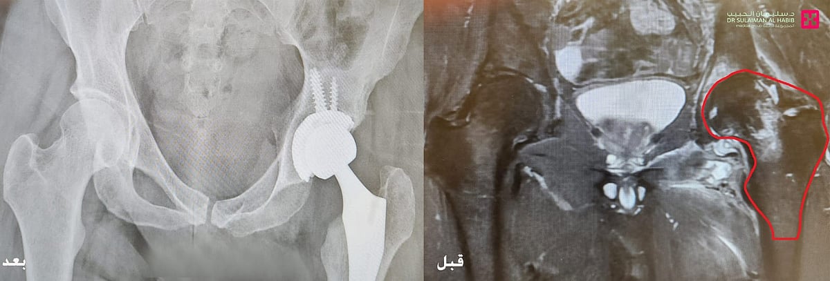 مشيراً إلى أن نتائج الفحوصات كشفت عن وجود التهاب شديد ومزمن في مفصل الورك، وهو المتسبب في نوبات الألم التي عانى منها المراجع طوال الأشهر الماضية ، وقرر الفريق الطبي التدخل الجراحي على مرحلتين، المرحلة الأولى استغرقت ساعتين تحت التخدير العام، وتم فيها إجراء عملية تنظيف لكامل العظم وإزالة رأس المفصل المتأثر من عوامل الالتهاب، وكذلك زراعة مفصل مؤقت حتى تتعافى منطقة الجراحة، وعقب مرور 8 أسابيع أخضع للعملية الثانية والتي تم فيها إزالة المفصل المؤقت، وزراعة مفصل صناعي كامل جديد للورك.