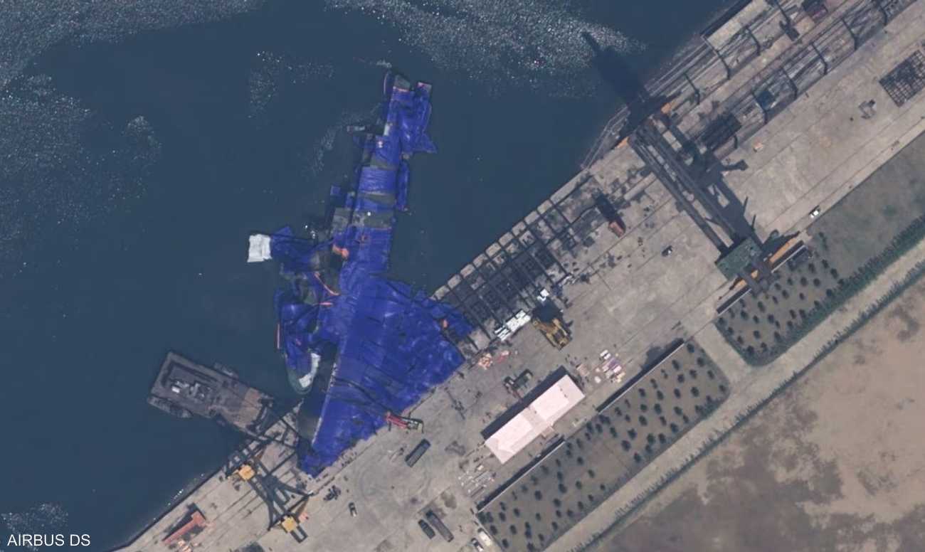 وتظهر الصور الملتقطة عبر الأقمار الاصطناعية، السفينة الحربية مغطاة بأغطية زرقاء، ومستلقية على جانبها ومقدمتها على اليابسة، بينما جزء كبير من مؤخرتها في الماء.