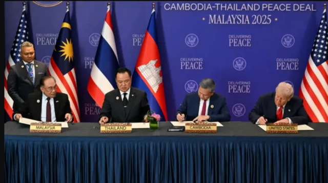 وقّع رئيس الوزراء التايلاندي أنوتين تشارنفيراكول ورئيس الوزراء الكمبودي هون مانيت "اتفاقية سلام" مشتركة، تحت إشراف الرئيس الأمريكي دونالد ترامب.