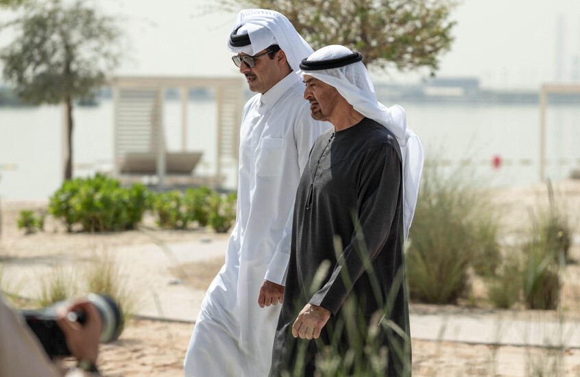 اجتمع أمير قطر تميم بن حمد آل ثاني مع رئيس الإمارات محمد بن زايد آل نهيان اليوم السبت في أبو ظبي خلال زيارة وصفتها وكالة الأنباء القطرية بـ"الأخوية".