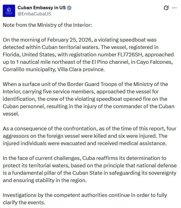 وأفادت الداخلية في البيان، بأنه في صباح يوم 25 فبراير 2026 تم رصد زورق سريع مخالف داخل المياه الإقليمية الكوبية.