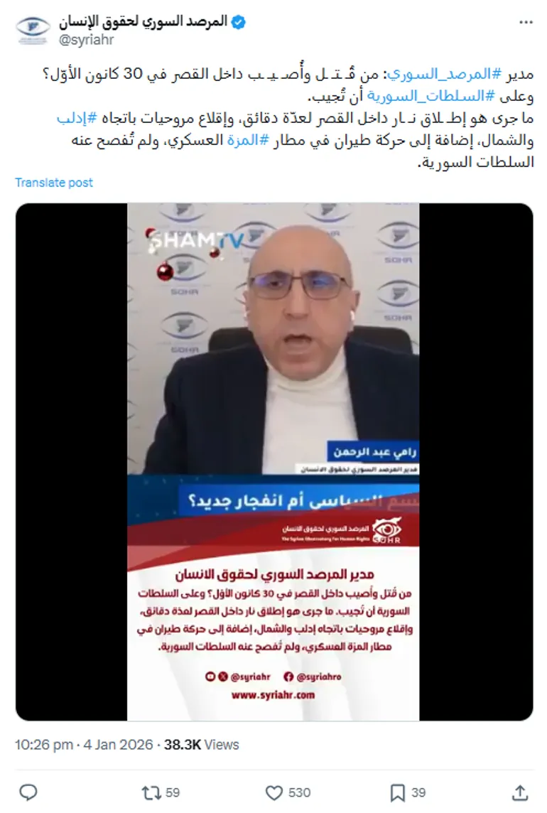 وبيّن التقرير أن الادعاءات بدأت بالترويج لوقوع اشتباكات مزعومة في محيط القصر الجمهوري بتاريخ 30 كانون الأول 2025، بين ما سُمي بـ"الحرس القديم لهيئة تحرير الشام" والحرس الجديد الموالي للرئيس، وزُعِم أن هذه الاشتباكات أسفرت عن إصابة الرئيس الشرع، ودخوله في حالة حرجة داخل أحد المشافي.