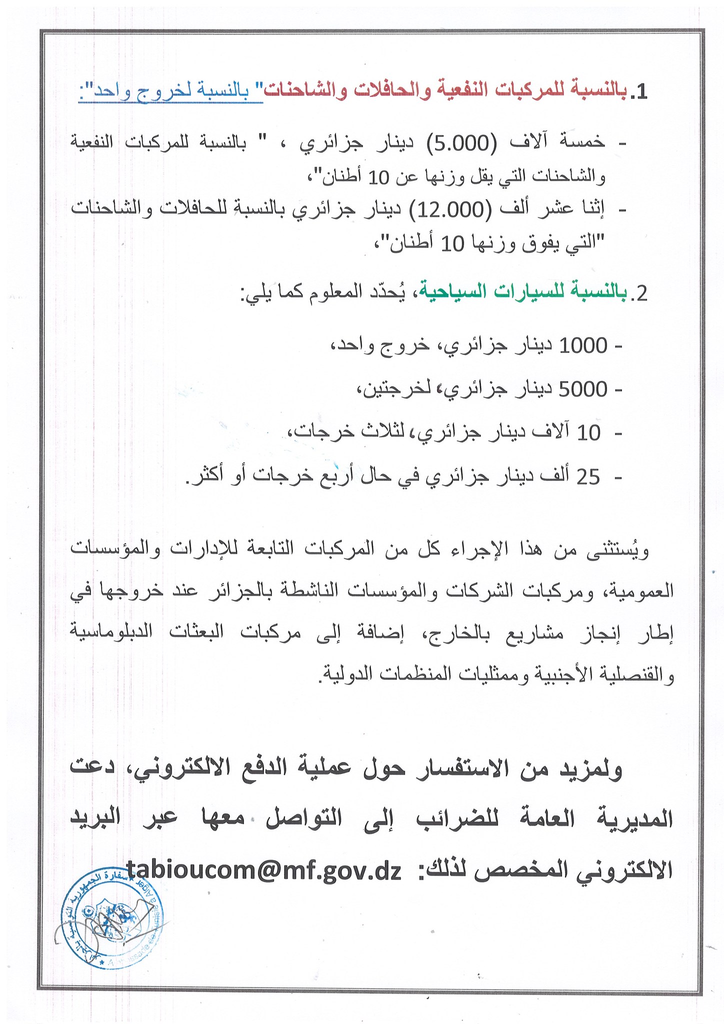 وبموجب التعريفات الجديدة، يُحتسب المعلوم للسيارات السياحية حسب عدد الخرجات اليومية، بواقع 1000 دينار جزائري للخروج الواحد، و5000 دينار لخرجتين، و10 آلاف دينار لثلاث خرجات، و25 ألف دينار في حال القيام بأربع خرجات أو أكثر.