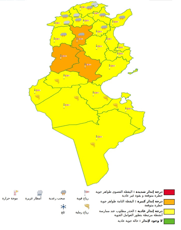 كما تكون الرياح قوية نسبيا إلى قوية بأغلب الجهات و قوية جدا تصل إلى حدود 100 كلم/س في شكل هبات خاصة قرب السواحل و بمرتفعات القصرين و سليانة وبجهة سيدي بوزيد مع مستوى يقظة برتقالي.