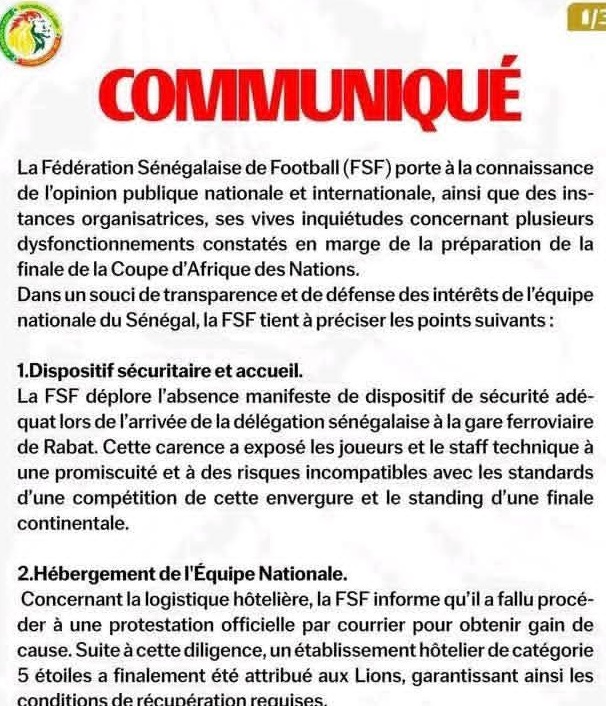 وجهت الجامعة السنغالية لكرة القدم للرأي العام الوطني والدولي وكذلك الهيئات المنظمة بيانا عبرت فيه بانشغالاتها العميقة بخصوص عدة اختلالات تم تسجيلها على هامش التحضير لنهائي كأس أمم إفريقيا.