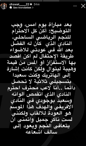 نشر لاعب النادي الإفريقي فراس شواط توضيحًا عبر حسابه الرسمي على إنستغرام، بعد تسجيله ثلاثية في شباك النجم الساحلي، أكد من خلاله أن احتفاله بالأهداف لم يكن يحمل أي نية للاستفزاز أو التقليل من قيمة النجم الساحلي، مشددًا على احترامه الكبير للفريق وجماهيره.