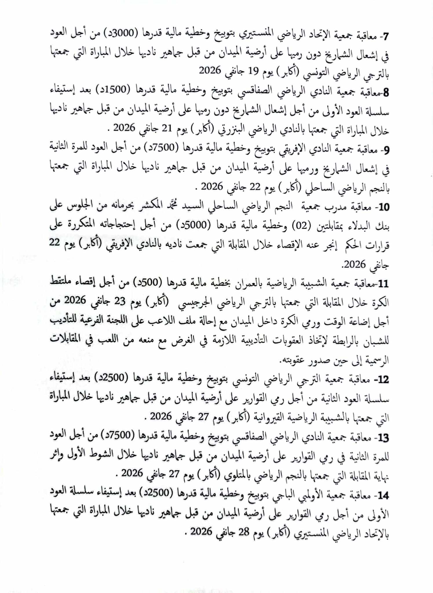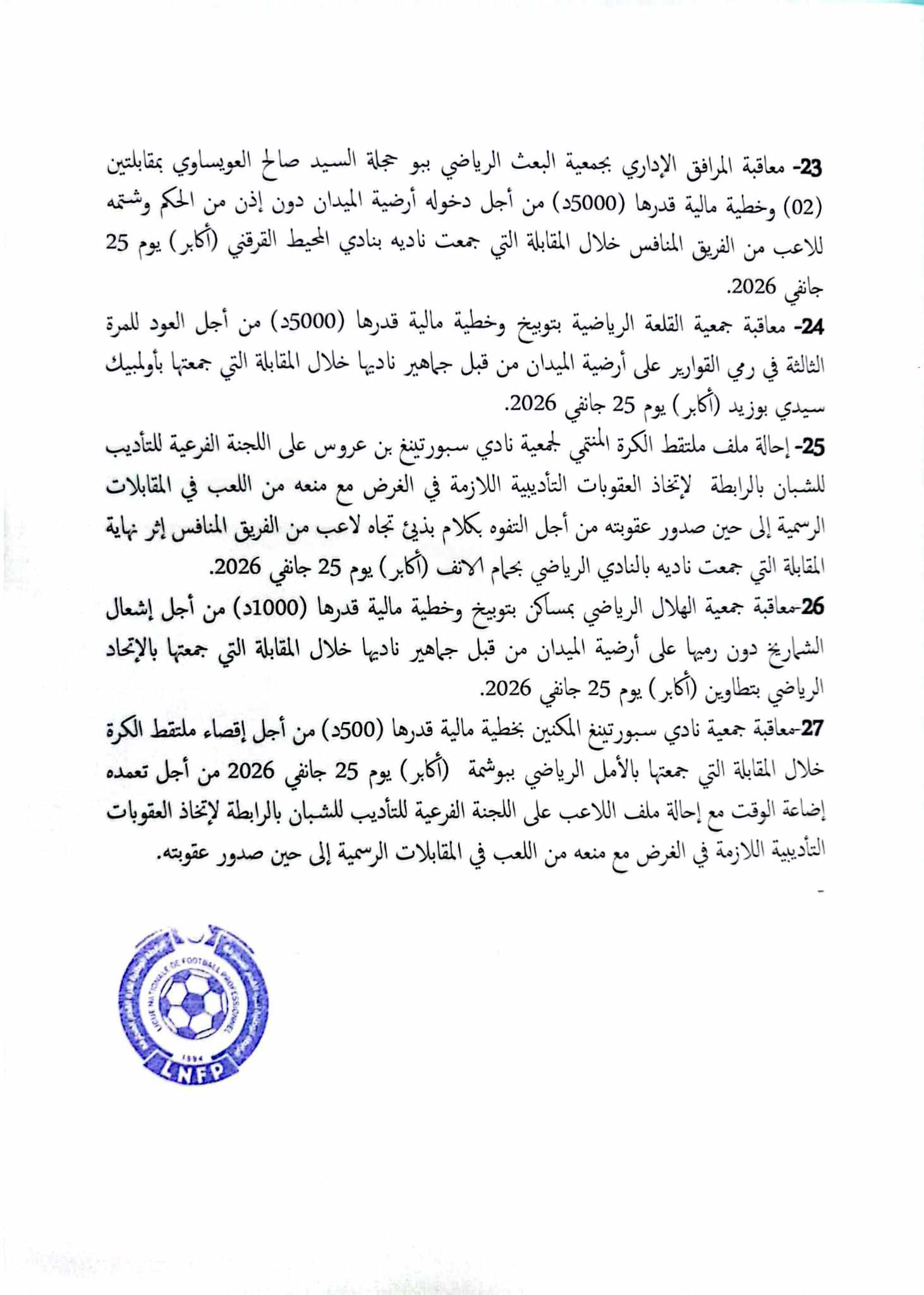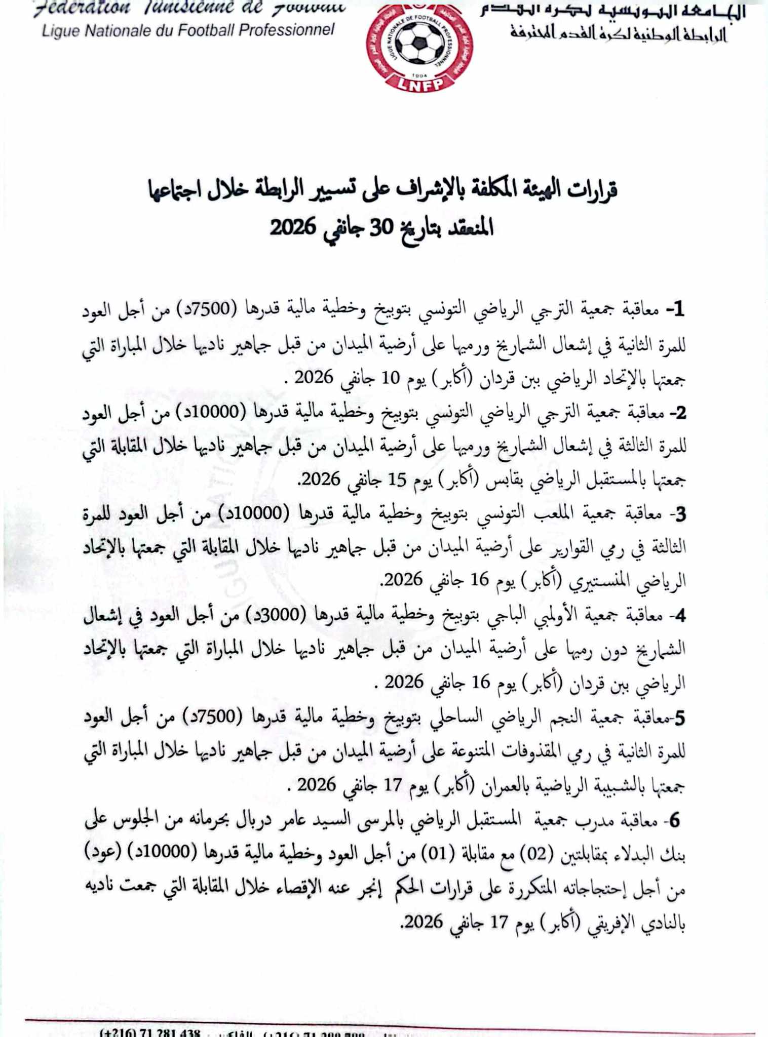 أصدرت الهيئة المكلّفة بالإشراف على تسيير الرابطة الوطنية لكرة القدم المحترفة، خلال اجتماعها اليوم الجمعة 30 جانفي 2026، جملة من العقوبات التأديبية شملت عدداً من أندية الرابطة الأولى و الثانية, و في ما يلي القرارات الكاملة :