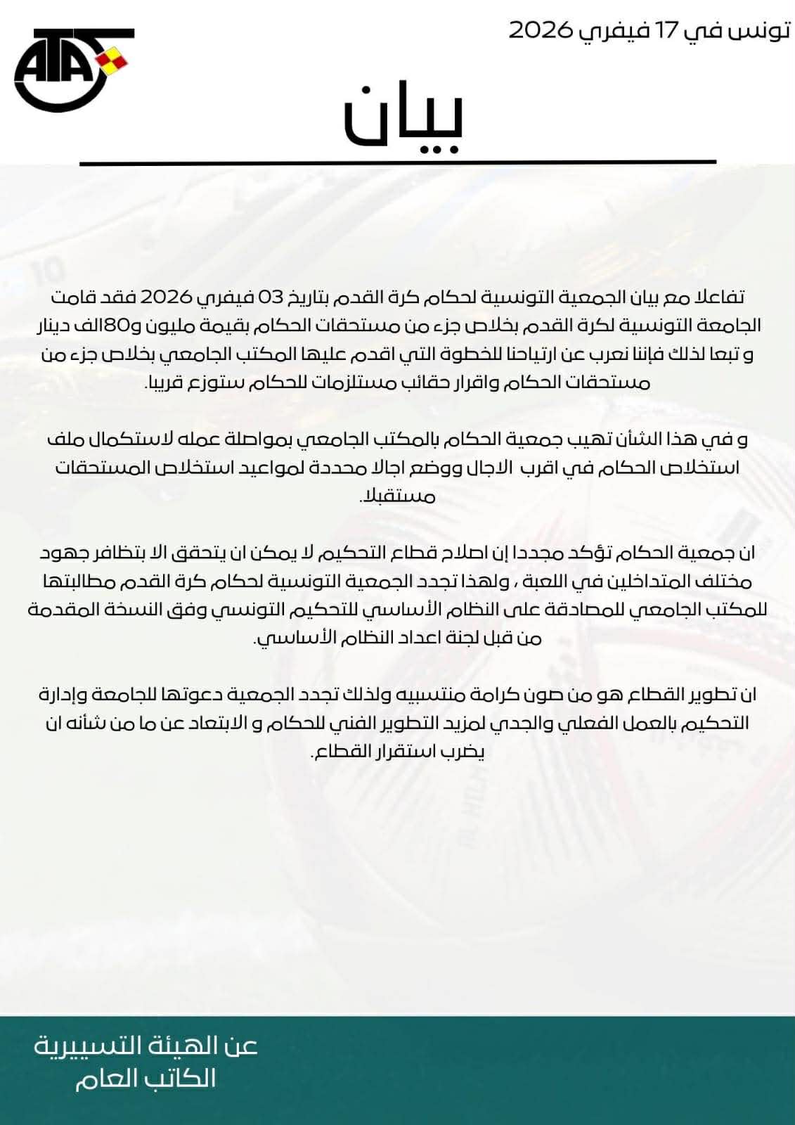 تفاعلت الجمعية التونسية لحكام كرة القدم مع قرار الجامعة بصرف جزء من مستحقات الحكام وإقرار توزيع مستلزمات لهم قريبًا.