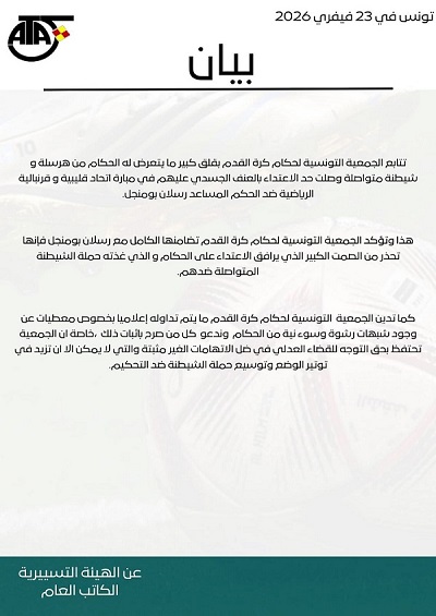 أصدرت الجمعية التونسية لحكام كرة القدم، اليوم الإثنين 23 فيفري 2026، بيانًا عبّرت فيه عن استنكارها الشديد لما يتعرّض له الحكام من حملات تشويه واعتداءات، مؤكدة تضامنها الكامل مع الحكم المساعد رسلان بومنيجل.