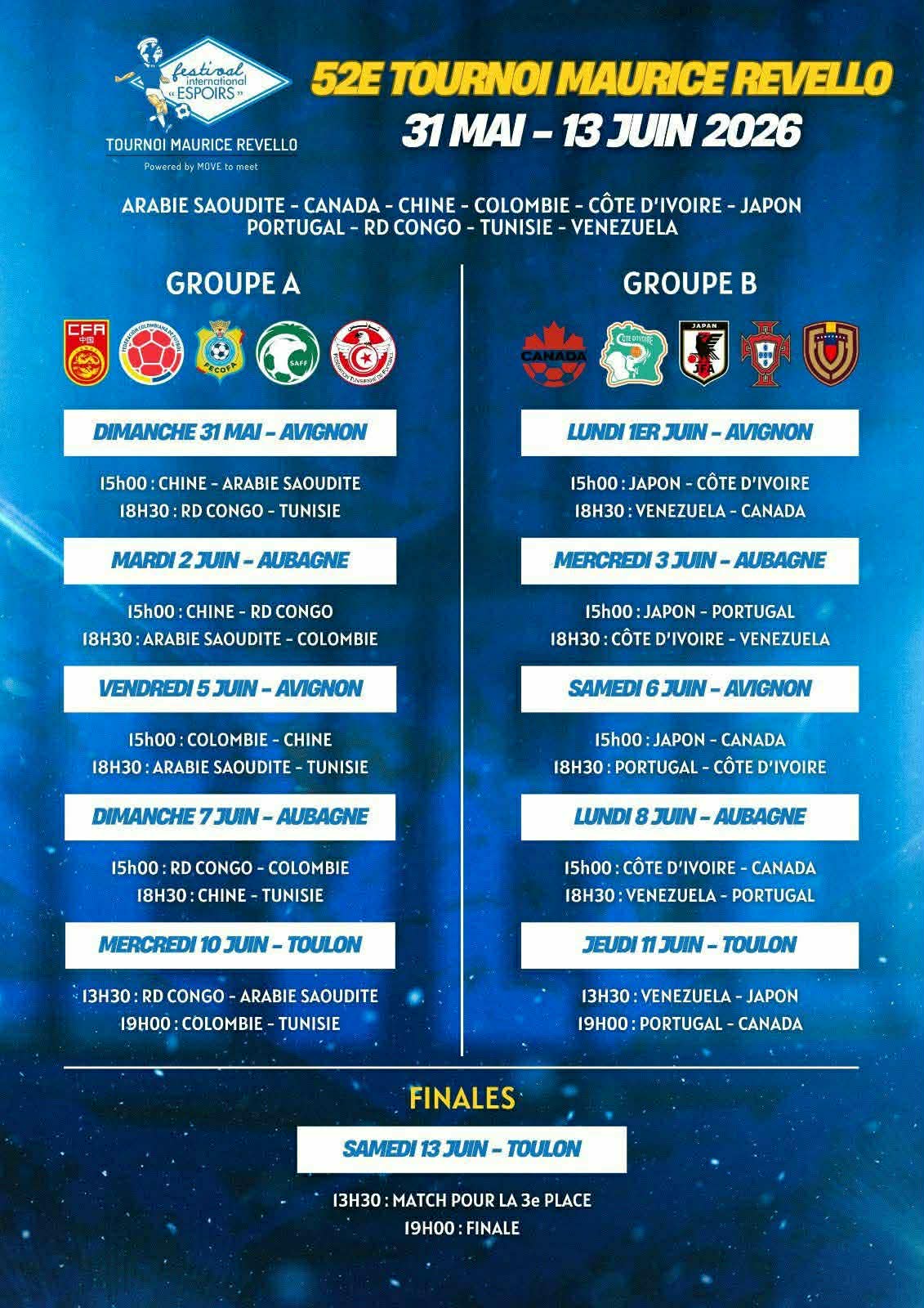يشارك المنتخب الوطني التونسي (مواليد 2005-2006) في النسخة الثانية والخمسين من دورة موريس ريفيلو 2026، التي ستُقام في فرنسا خلال الفترة الممتدة من 31 ماي إلى 13 جوان 2026، بمشاركة منتخبات شابة من مختلف أنحاء العالم.
