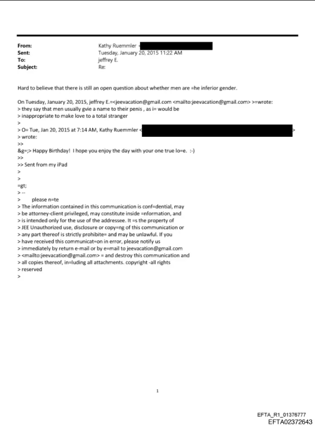 كشفت وثائق جديدة للمجرم الجنسي الراحل جيفري إبستين، عن مزحة بينه وبين كاثي رويملر، كبيرة المحامين في "غولدمان ساكس" والمستشارة في البيت الأبيض سابقا، حول "عضوه الذكري".