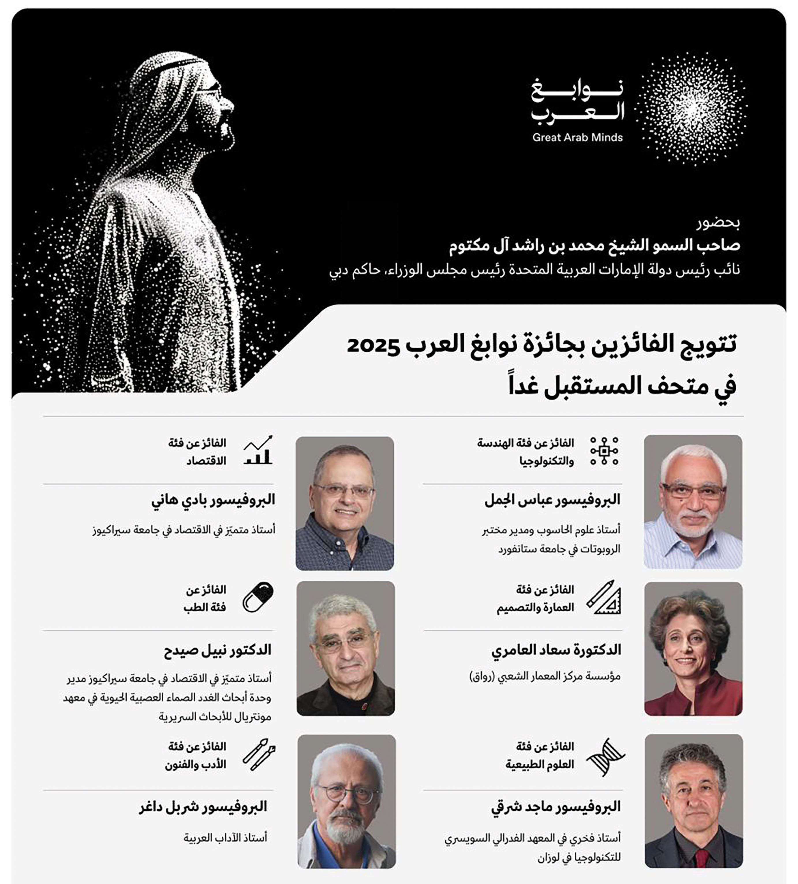 يكرّم صاحب السموّ الشيخ محمد بن راشد آل مكتوم، نائب رئيس الدولة رئيس مجلس الوزراء حاكم دبي، رعاه الله، غداً، الفائزين الستة بلقب جائزة «نوابغ العرب 2025»، في متحف المستقبل بدبي.