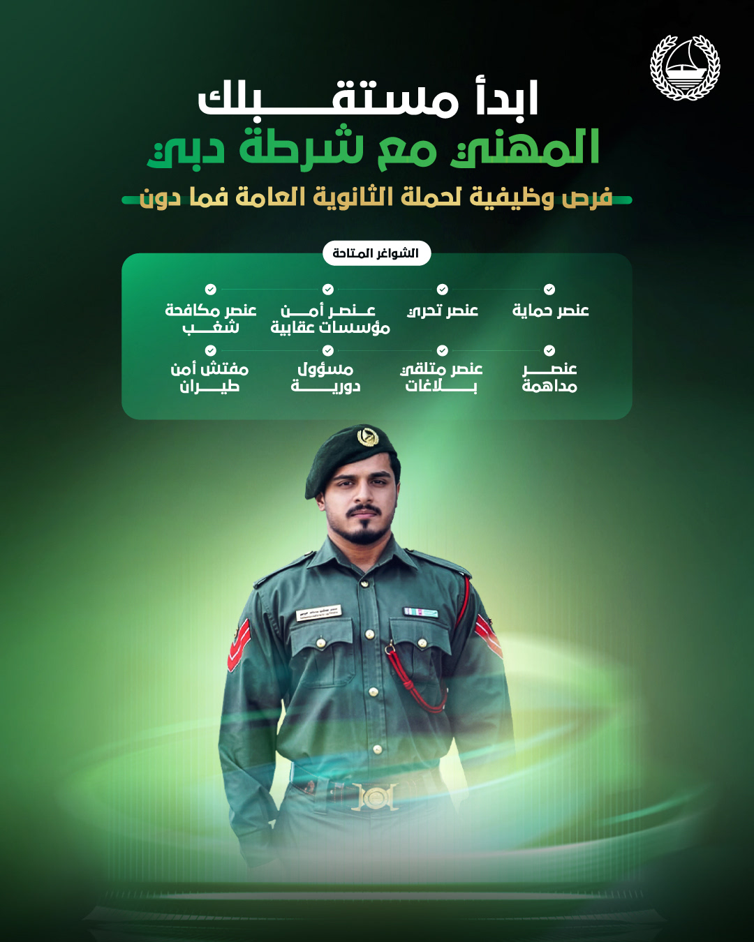 أعلنت القيادة العامة لشرطة دبي عن فتح باب التقديم لشغل 8 وظائف تخصصية لأبناء دولة الإمارات العربية المتحدة، في إطار استراتيجيتها الرامية إلى تعزيز الجاهزية الأمنية ورفد منظومتها بكفاءات وطنية مؤهلة. وتشمل الشواغر الوظيفية، عنصر حماية، وعنصر تحري، وعنصر أمن مؤسسات عقابية، وعنصر مكافحة شغب، وعنصر مداهمة، وعنصر متلقي بلاغات، ومسؤول دورية، ومفتش أمن طيران.