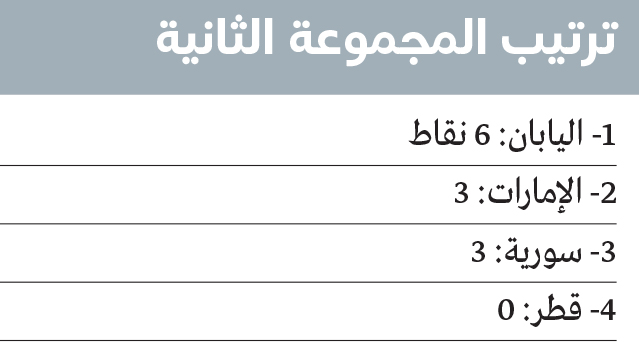 ويلتقي في المجموعة ذاتها اليوم منتخبا اليابان وقطر، إذ يتصدر المنتخب الياباني ترتيب المجموعة برصيد ست نقاط، فيما يحل الأولمبي في المركز الثاني برصيد ثلاث نقاط، بفارق الأهداف عن المنتخب السوري الذي يحتل المركز الثالث، بينما يأتي المنتخب القطري في المركز الأخير دون رصيد.