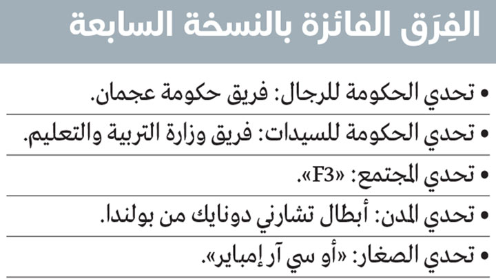 وفي ختام النهائيات، تمكن فريق حكومة عجمان من حسم نتيجة تحدي الحكومة للرجال، بعد تمكنه من تجاوز العوائق الستة والظفر بلقب البطولة، فيما تلاه فريق شرطة دبي في المركز الثاني، وحلّ فريق دائرة عجمان الرقمية في المركز الثالث بعد استكماله أربعة عوائق، أما في تحدي الحكومة للسيدات، فقد جاء فريق وزارة التربية والتعليم في المركز الأول، بعد تمكّن لاعبات الفريق من تجاوز ثلاثة عوائق في مسار التحدي، تلاه دبي الصحية ثانياً، وفريق شرطة دبي الذي حصل على المركز الثالث.