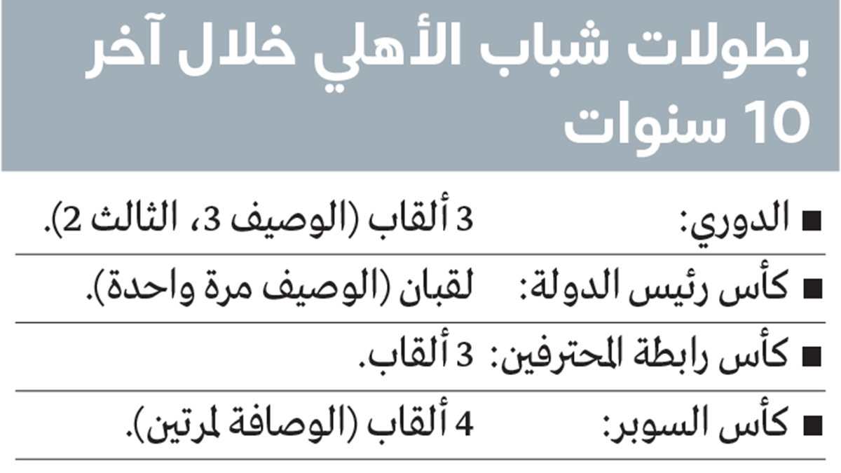 وعند النظر إلى الأرقام خلال آخر 10 سنوات، تتضح صورة فريق لا يغيب عن القمة، ففي الدوري منذ موسم 2015-2016، حقق شباب الأهلي اللقب ثلاث مرات، وحلّ وصيفاً ثلاث مرات أيضاً، واحتل المركز الثالث لمرتين، والخامس لمرتين، إلى جانب موسم ملغى كان يتصدره قبل الإلغاء.