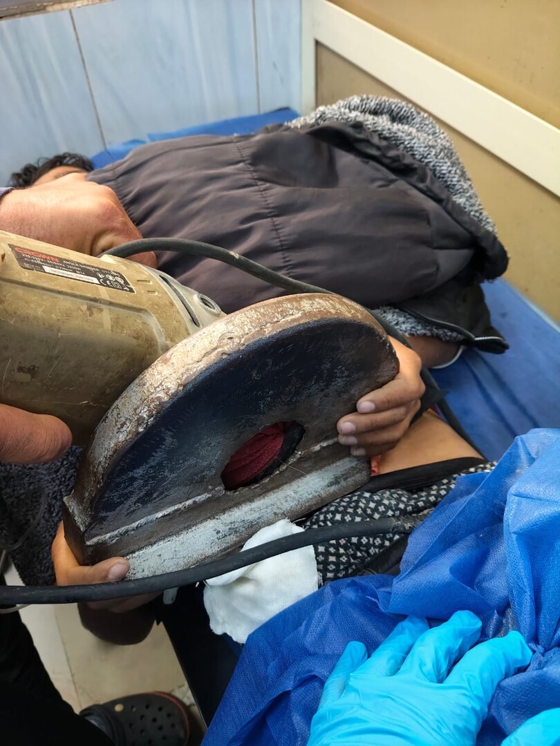 ولم تتضح ملابسات دخول المنشار الكهربائي في جسد الطفل، لكن الصور تظهر حالة مروعة بانغماس الشفرة الحادة للمنشار في بطن الطفل الذي ظهر مستلقيا على سرير المستشفى وأمعاؤه خارج البطن، يرقد بين الحياة والموت.