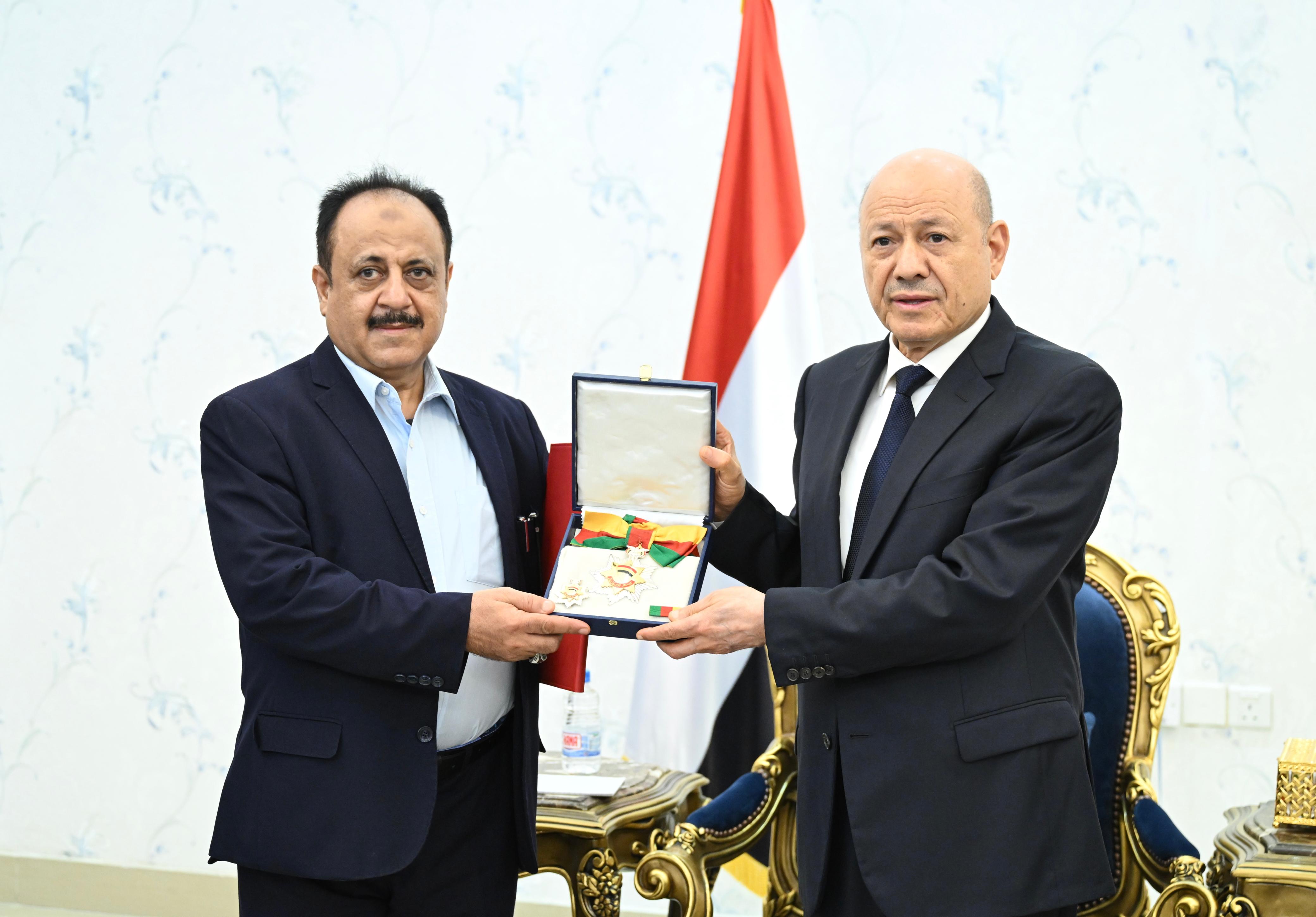 رئيس مجلس القيادة يقلد رئيسي جهازي الامن السياسي والقومي السابقين وسامي الشجاعة