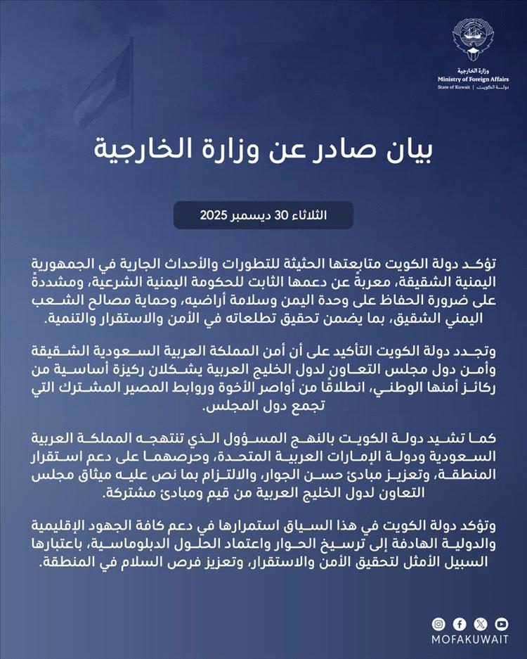 ‏تتابع سلطنة عُمان التطورات المتعلقة بالجمهورية اليمنية، وتؤكد استمرار موقفها الداعي إلى ضبط النفس، وتغليب صوت الحكمة، عبر معالجة كافة القضايا بالتي هي أحسن عبر الحوار وتحقيق التراضي والتفاهم الأخوي المنشود بما يخدم أمن ومصلحة اليمن والأمن الوطني لدول الجوار.